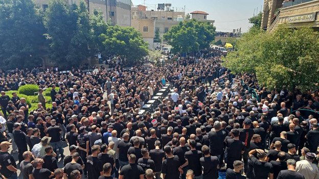 توافد الالاف صباح اليوم الاحد الى مجدل شمس لتشييع الاطفال ضحايا سقوط الصاروخ على الملعب امس السبت.