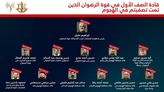 وصل بيان صادر عن الناطق بلسان الجيش الإسرائيلي جاء فيه: “في غارة دقيقة مساء أمس (الجمعة)، هاجمت طائرات حربية تابعة لسلاح الجو بتوجيه استخباراتي من هيئة الاستخبارات، وقتلت قائد “قوة الرضوان” التابعة لحزب الله إبراهيم عقيل خلال اجتماع مع قادة في قوة الرضوان في الضاحية الجنوبية”.