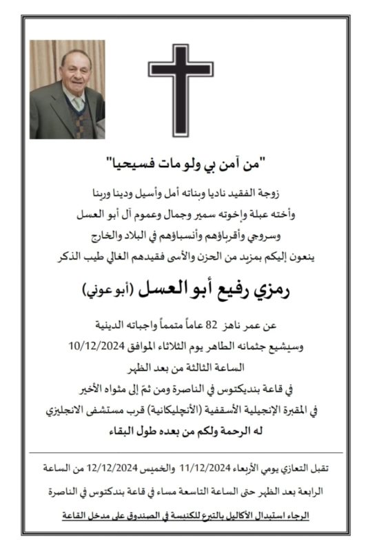 قرب المستشفى الانجليزي. تقبل التعازي يومي الاربعاء والخميس، من الساعة الرابعة بعد الظهر حتى التاسعة مساء في قاعة بندكتوس في الناصرة.