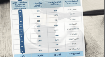 كما جاءت القدس في صدارة عدد ملفات الطلاق من حيث الحجم، بـ 1,103ملفات طلاق مقابل4,191 حالة زواج.