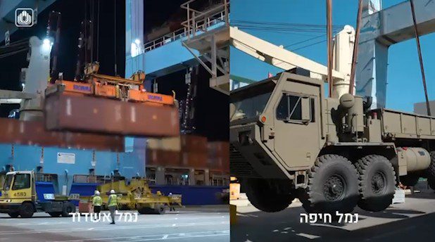 أعلنت وزارة الأمن الإسرائيلية انه تم خلال 24 ساعة تفريغ حمولة سفينتيْن وعدد من الطائرات، التي حملت الالاف من القطع العسكررية والأسلحة والذخيرة والصواريخ، بالاضافة الى معدات عسكرية يصل وزنها الى حوالي 6500 طن.